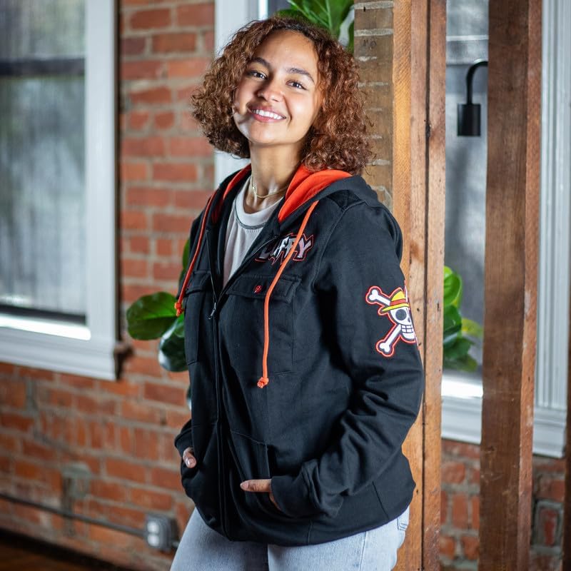 Start your pirate adventure on the Grand Line with our One Piece Luffy Full Zip Hooded Sweatshirt! Designed for treasure hunting on the high seas, this unique hoodie features dual sheathed button-down shoulder epaulettes, chest pockets, Luffy's jolly roger embroidered on the sleeve, and contrasting red drawstrings & inner hood lining. You’ll feel like a member of the Straw Hat Pirates aboard the Thousand Sunny when you wear this premium One Piece merch!